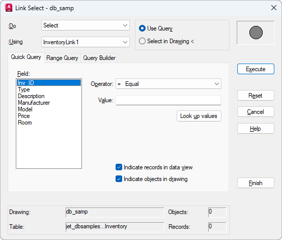 Displays the current status information based on the running Link Select operation. The current drawing and table are displayed, as well as the number of linked objects and records that currently meet the specified Link Select parameters.