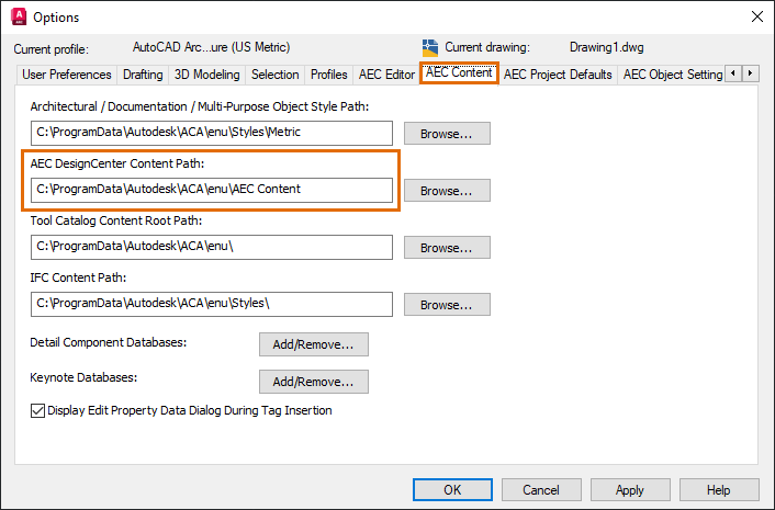 To locate the content pack files, enter OPTIONS in the command line. In the Options dialog box, select the AEC Content tab.