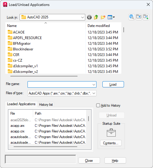Note: AutoCAD LT doesn't support ObjectARX, VBA, and DBX applications.If you select a file that is already loaded, Load reloads the application when applicable. You cannot reload ObjectARX applications. In this case, you must first unload the ObjectARX application and then load it again. The Load option is also available from a shortcut menu by right-clicking a file on the History List tab.