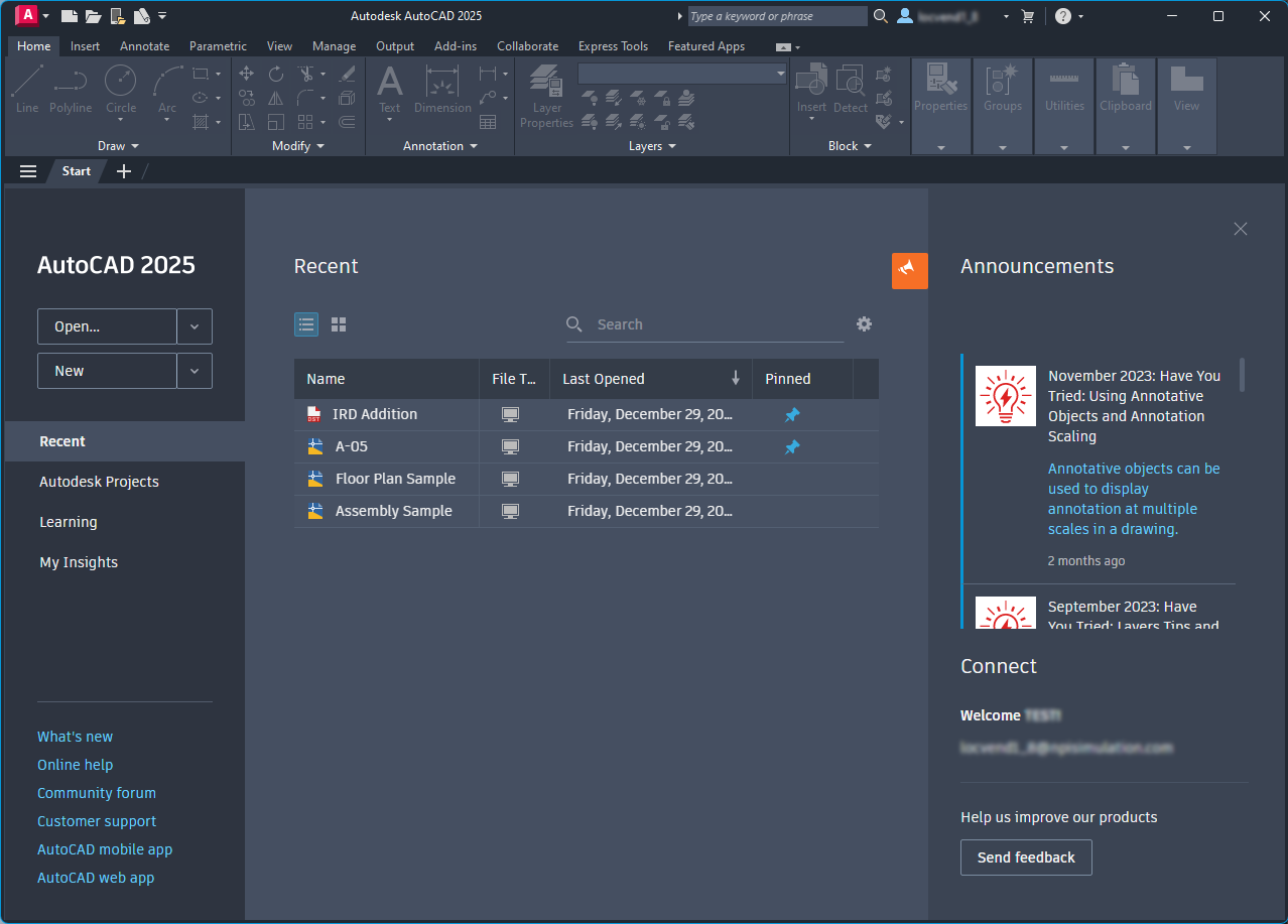 The Start tab is displayed by default at startup, providing easy access to a variety of initial actions, including access to drawing template files, recently opened drawings and sheet sets, online and learning options, and announcements.