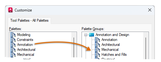To organize and reduce the number of tool palettes in the tool palettes window, you can define and display tool palette groups. A tool palette group limits the number of palettes displayed in the Tool Palettes window. The Customize Palettes option provides options to create and organize tool palette groups.