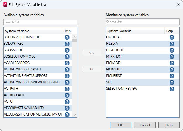 Lists all available system variables that can be monitored. Enter a string on the search box to quickly find a system variable.
