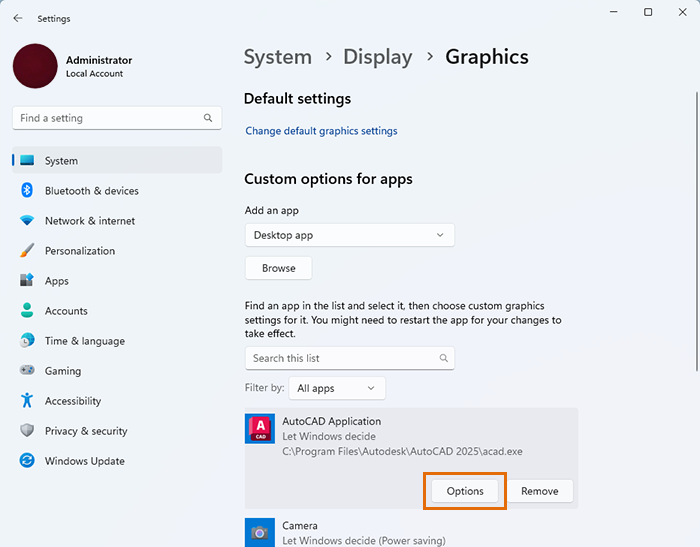 When working with Autodesk applications that are graphically intense, the switching of the graphics adapter in the middle of operation can lead to display and performance issues or program crashes. Also, by default, the system may load the software with the low-end video option and not switch to the high-performance GPU. Configuring the system to always use discrete graphics for the software will avoid these issues.
