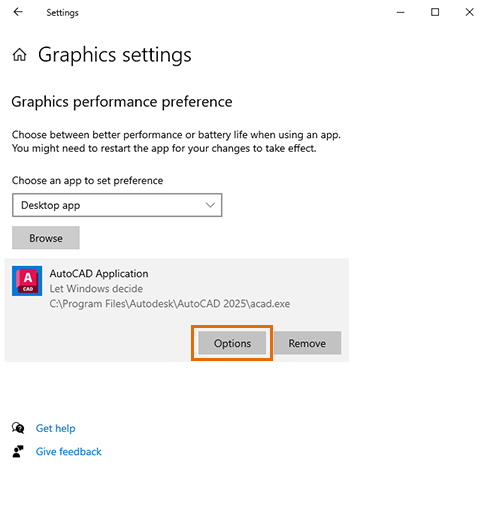 - Click Browse and then navigate to and select the software executable. As an example, for AutoCAD 2025, this would be C:\Program Files\Autodesk\AutoCAD 2025\acad.exe. Double-click acad.exe to add it to the list.