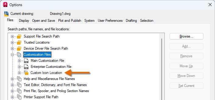 Many user interface elements display a custom image, that custom image is migrated when the command or user interface element that custom image is migrated between CUIx files. Custom images referenced by commands and user interface elements defined in a CUIx file are stored in one of two locations: inside of the CUIx file or externally in the location defined by the Custom Icon Location setting. Based on how a custom image is referenced, the process used to migrate that custom image is different.