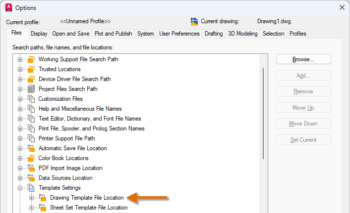 Drawing template (DWT) files are used to create new drawings. The drawings created using a DWT file contain all of the styles and drawing objects defined in the DWT file. The custom DWT files from the previous release are migrated into a subfolder named after the release in which they were migrated; the naming convention of the subfolder is Product Name Templates. The Product Name Templates subfolder is created under the folder defined by the Drawing Template File Location setting.