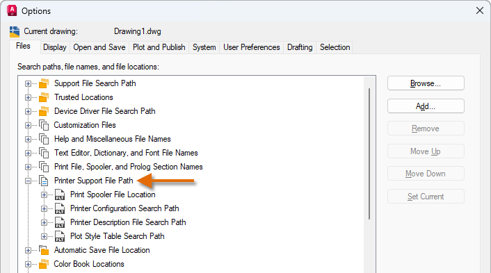 • Plotter Configuration (PC3) Files. Identifies the electronic formats and devices available to output a drawing. The PC3 files from a previous release are migrated to a subfolder named after the release in which they were migrated; the naming convention of the subfolder is Product Name PC3 Files. The subfolder is created to maintain compatibility with both the previous and current product release. The Product Name PC3 Files subfolder is created under the location defined by the Printer Configuration Search Path setting.