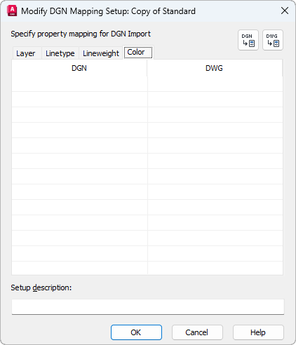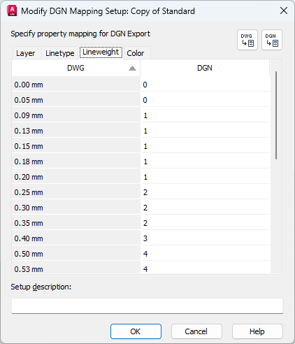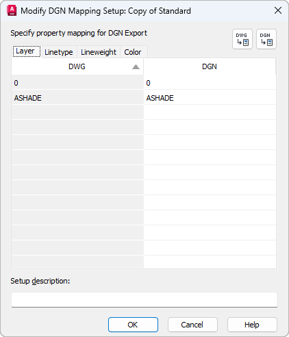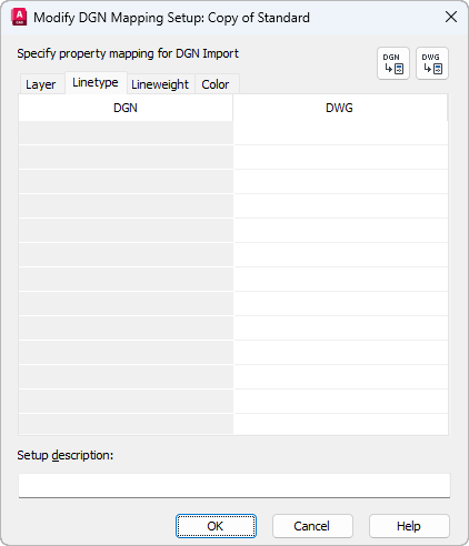 Export mapping setup: If you have accessed the Modify DGN Mapping Setups dialog box by creating a new setup from the Export DGN Settings dialog box, the DWG column includes all defined linetypes in the current drawing file. Whenever the target cell is blank (right-hand column), we will use the default system mapping.