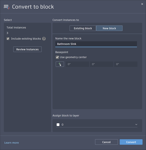 You can also convert the source object or the selected instances to a new block. In the Convert dialog box, define a new block by specifying a block name and insertion point. By default, the insertion point is set to the center of the selected geometry.