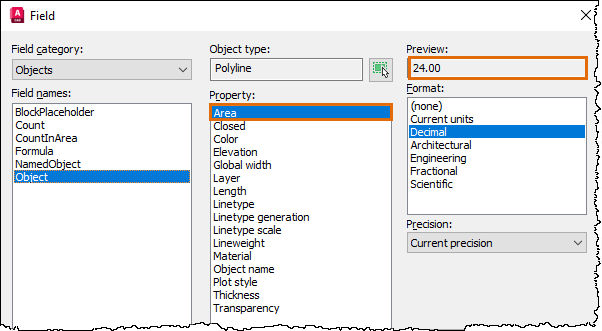 6. In the drawing window, select the polyline that defines the perimeter of RM 1. The Field dialog box redisplays.