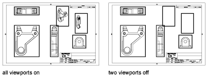 Displaying a large number of active layout viewports can affect your system's performance as the content of each layout viewport regenerates. You can save time by turning some layout viewports off or by limiting the number of active viewports. The following illustration shows the effects of turning off two layout viewports.
