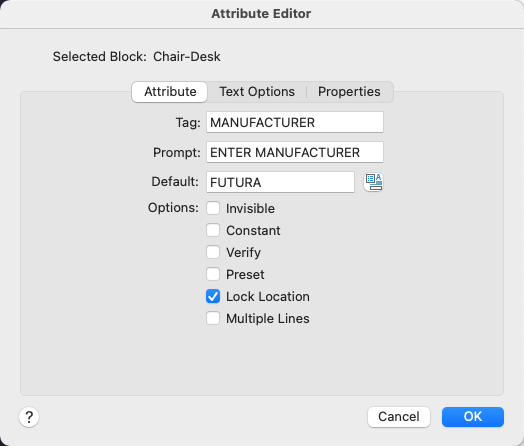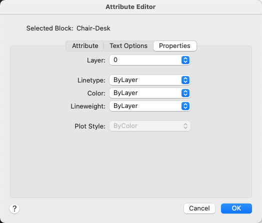 Defines the layer that the attribute is on and the color, lineweight, and linetype for the attribute's line. If the drawing uses plot styles, you can assign a plot style to the attribute using the Properties tab.