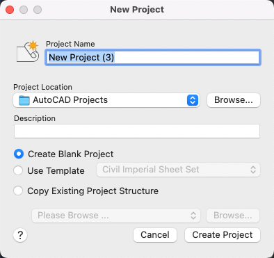Creates a new empty project using the default settings and property values.