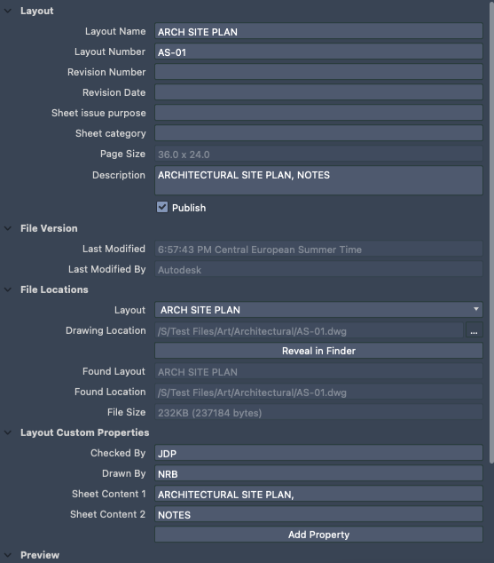 Displays information that is specific to the selected layout, such as the name, number, and whether it will be included in publishing operations. Also displays custom properties, if any.