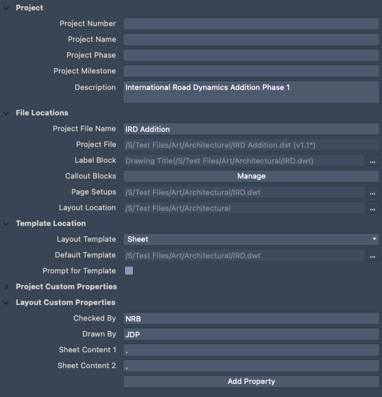 Displays the paths for the project, page setup overrides, and the callout and label blocks used by the project.