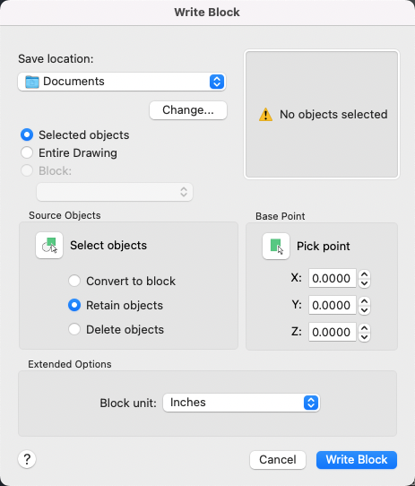The Write Block dialog box displays different default settings depending on whether nothing is selected, a single block is selected, or objects other than blocks are selected.