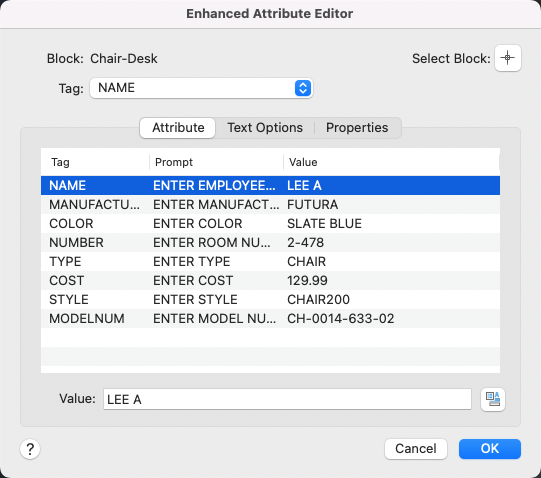 Lists the attributes in the selected block instance and displays the tag, prompt, and value for each attribute.