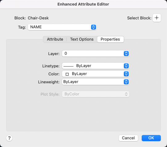 Defines the layer that the attribute is on and the lineweight, linetype, and color for the attribute text. If the drawing uses plot styles, you can assign a plot style to the attribute using the Properties tab.