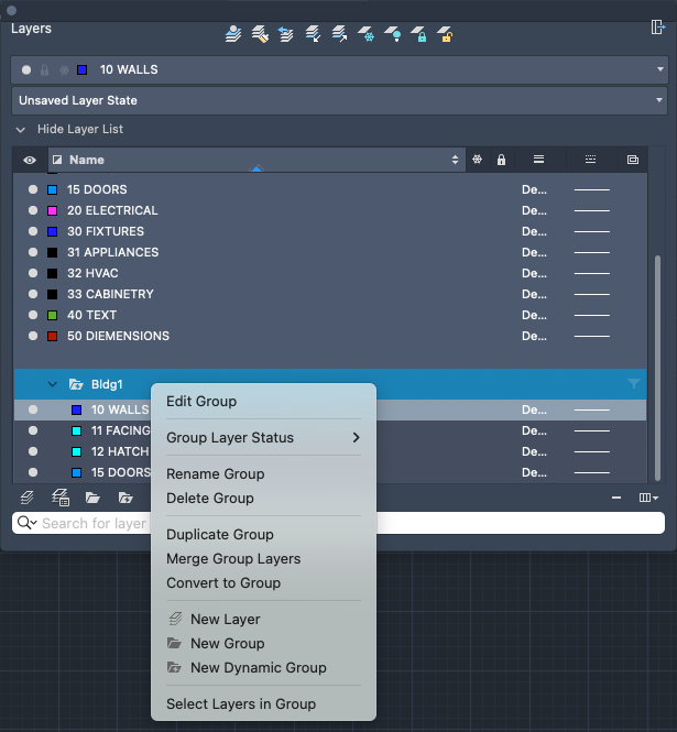 Note: Be careful about deleting layers or layer groups if you are working on a drawing in a shared project or one based on a set of layering standards.