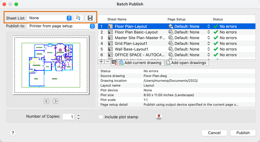 - Once you've added your drawings and layouts for publishing, click Save