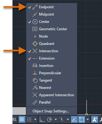 7. Right-click the Object Snap button and select both Endpoint and Intersection if they aren’t already checked.