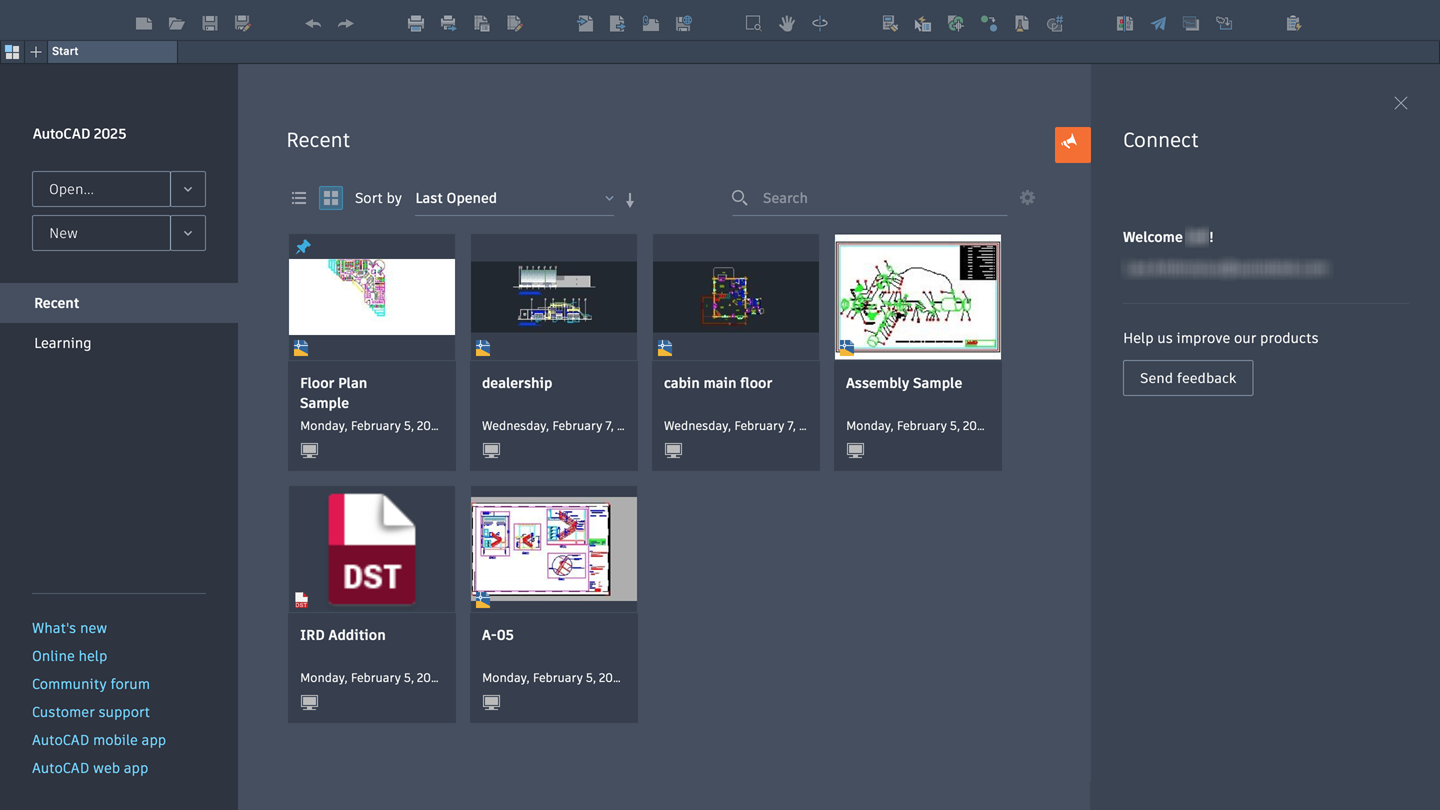The new Start tab replaces the Welcome screen, providing a consistent welcome experience across AutoCAD on macOS and Windows along with other Autodesk products.