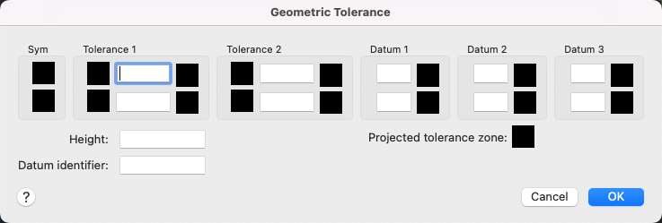 Creates the first tolerance value in the feature control frame. The tolerance value indicates the amount by which the geometric characteristic can deviate from a perfect form. You can insert a diameter symbol before the tolerance value and a material condition symbol after it.