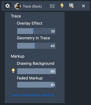 Geometry in Trace: Adjust the transparency of the trace geometry in the background. When TRACEFRONT is on, geometry in the drawing is affected. When TRACEBACK is on, geometry in the trace is affected.