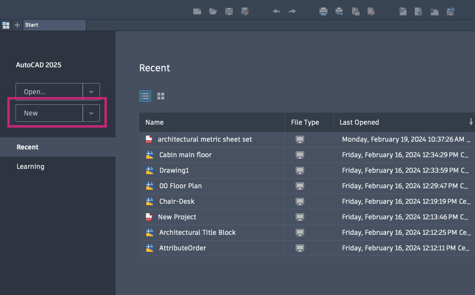 After you launch AutoCAD, on the Start tab, click New or click the New drop-down menu to begin a new drawing.