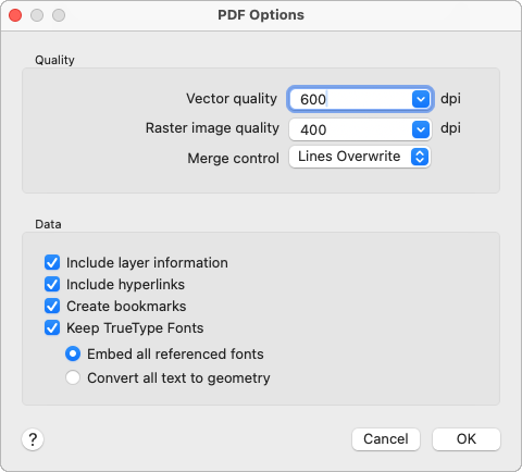 Controls the resolution of raster images. If the PDF file is intended for printing from a viewer, select a resolution to match the output of the plotter or printer. If the PDF file is intended for on-screen viewing select a high resolutions (above 2400 dpi). The raster image quality cannot exceed the vector image quality.