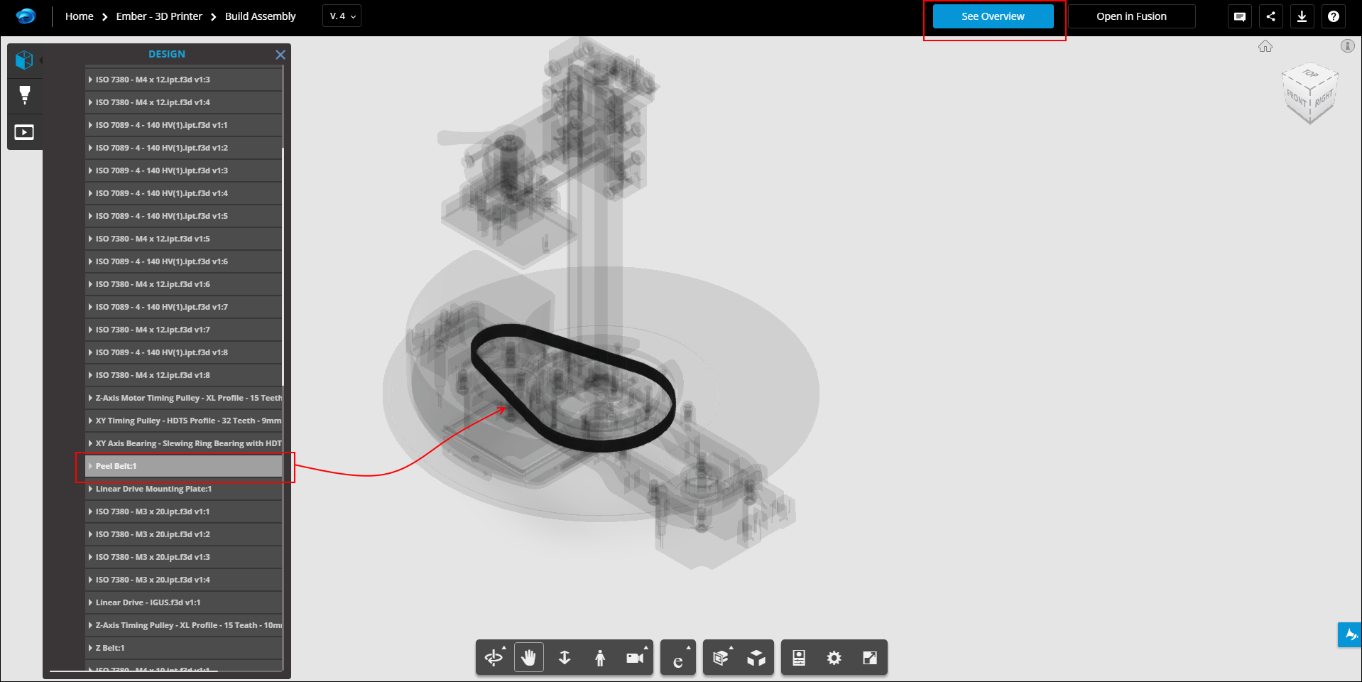To view and explore a design and its part, click the Design icon to view the parts of the assembly. You can select and isolate a part as well as search for a part. Click a part name to select it.