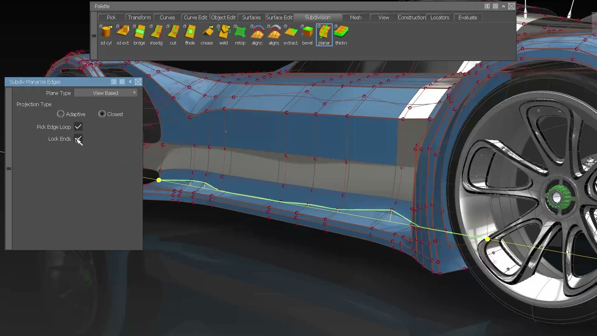 A new Subdiv Planarize Edge tool planarizes subdivision edges and edge loops by projecting the edges to a best fit, view based plane, or perpendicular to the X, Z, or Y axis. Use this tool to quickly clean up uneven patterns in edges of the subdivision control cage. Like the Planarize Hull tool for NURBS surfaces, you can choose plane types based on current view, the X, Y, and Z axis, as well as a best fit plane. Each plane type displays a yellow preview plane in the viewport showing the orientation of the alignment. The distance and direction of the affected CVs' movement displays as yellow lines.