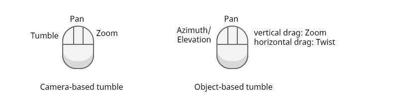 Camera-based tumble is the default. This keeps the Z axis of the camera vertical, like a movie camera. This is the default setting and is most similar to general CAD and modelling applications.