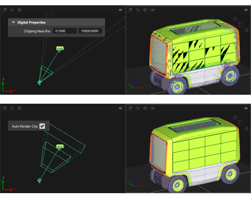 Turning on Auto Render Clip disables the display of the clipping plane near and far values in the Digital Properties section below. When you turn off Auto Render Clip, the manual settings update and can be adjusted if needed. For example, the Auto Render Clip settings may be too close to the surfaces and obscure CV display for example. So, you may want to increase the space around the objects.