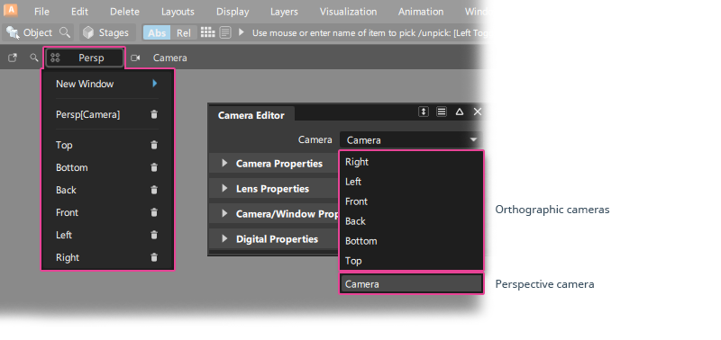 The Camera Editor lists the properties of all the orthographic and perspective camera views in your scene.