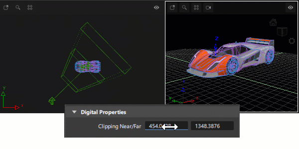 If the View point is not between the near and far clipping planes, Auto Focus focuses the camera at either the near clipping plane, or at the far clipping plane, whichever is closer to the View point.