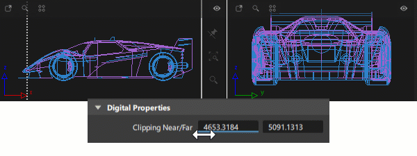 For orthographic windows, the Clipping Near/Far values are distances along the axis that points into the screen. For example, if the Back window shows the YZ plane, then the Clipping Near/Far values are distances along the X axis.