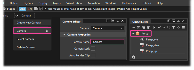 Use the drop-down menu to select a camera to display its properties in the Camera Editor.