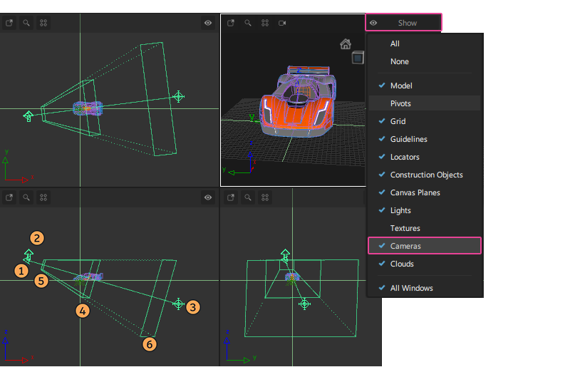 A single scene may contain several cameras. For example, by default a scene contains four cameras corresponding to the four modeling windows: top, front, right, and perspective (camera).