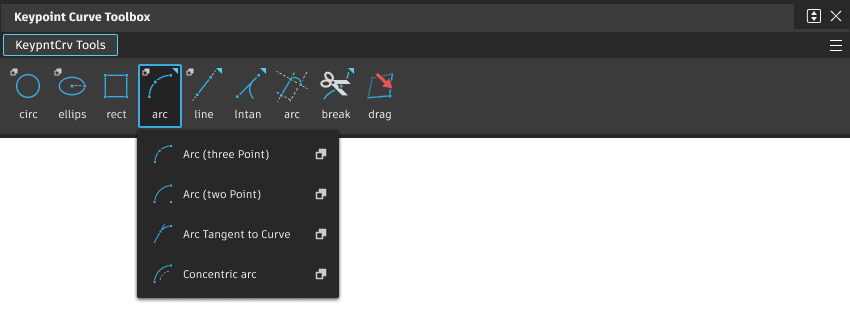 Use this tool to create different type of arc curves. There are four Keypoint Curve Arc tools: Arc (three) point, Arc (two) point, Arc Tangent to Curve, and Concentric Arc.