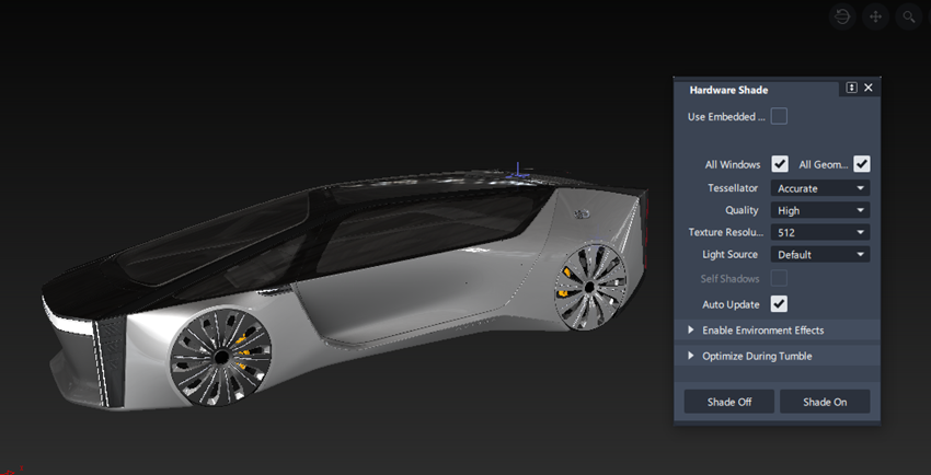 If the file has been saved in Alias2020 or later, Hardware Shade settings were saved with the wire file, and will be used by checking this option.