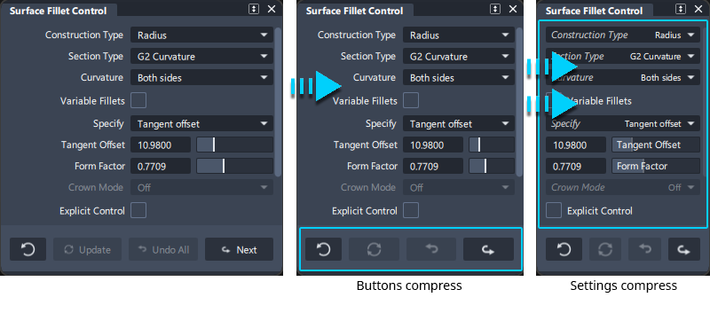 Undo All - reverses the geometry created, for example removing a fillet surface and un-trimming the base surfaces.