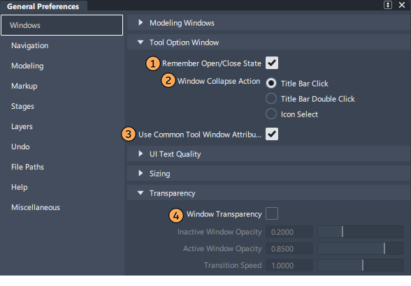 - Allow Transparency - If Window Transparency is enabled in the General Preferences > Windows > Transparency section. This controls whether this particular window becomes transparent or not.