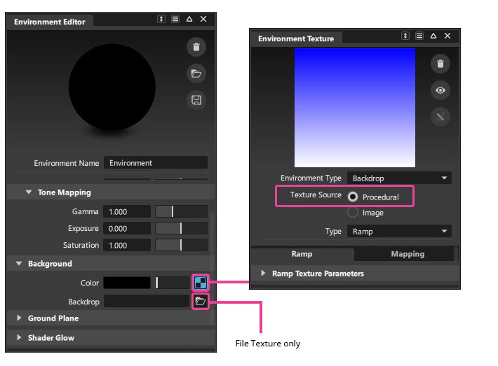 The Texture editor opens when a texturable channel in the Shader Editor or Environment Editor is selected.