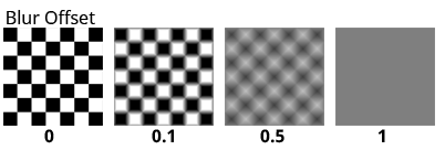 Blur Offset - An offset factor that controls the amount of texture blur in texture space. That is, the amount of blur is the same no matter where the object is relative to the camera. The slider range is 0 (no blur) to 1 (completely blurred). The default value is 0.