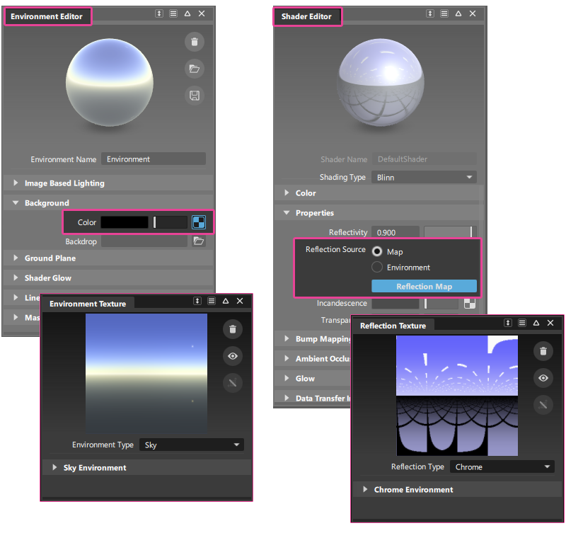 - Environment Shader: Background > Color - to create a surrounding image for objects to reflect.
