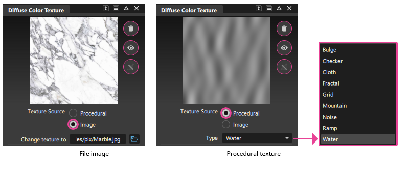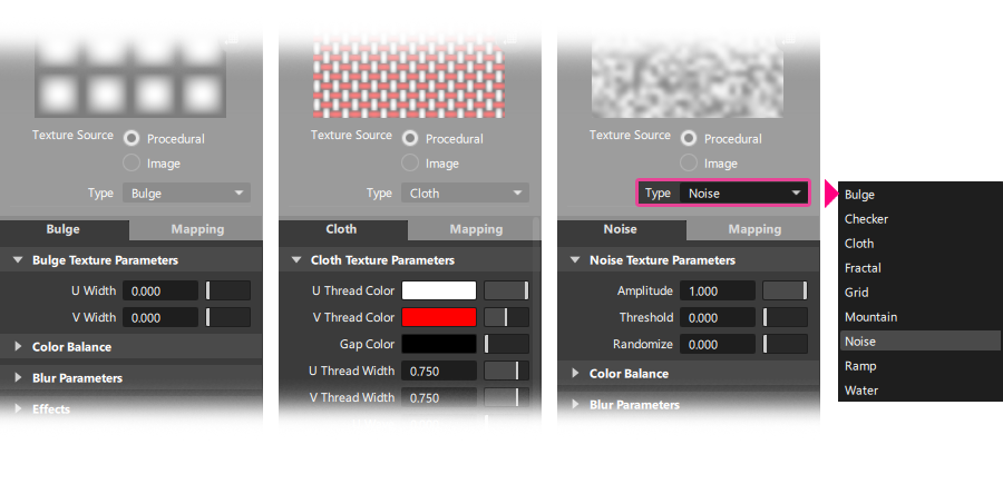 Procedural - Select an procedural texture from the Type drop-down list. For details of each texture see the Procedural parameters section below.