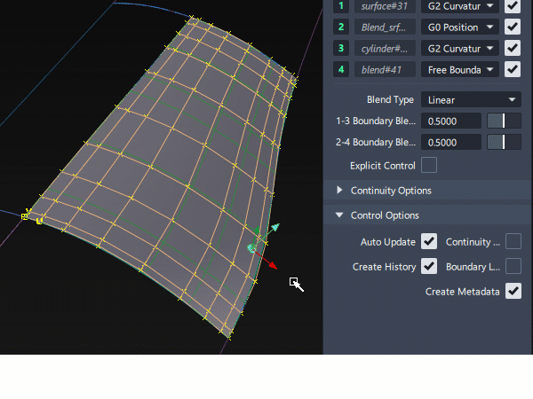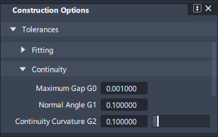The accuracy with which continuity levels are achieved is determined by the Construction Options settings chosen by the user. Larger tolerance values will allow quicker calculation but less accurate results. Smaller tolerance values will provide more accurate continuity but may result in more complex surfaces and longer build times.