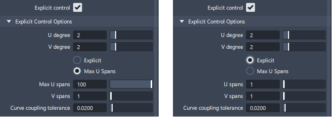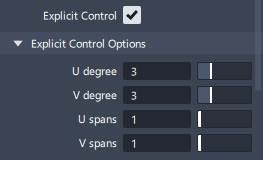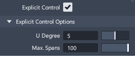 The Explicit Control option allows you to set the Degree and Spans of a curve or surface created or modified by the tool.