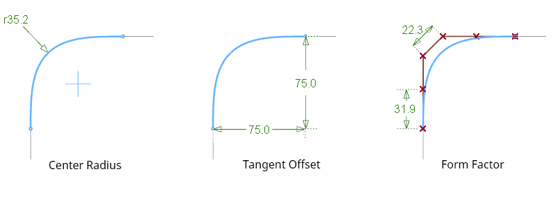 The Form factor controls the shape of a fillet or blend when G1 Tangent or G2/G3 Curvature are selected.